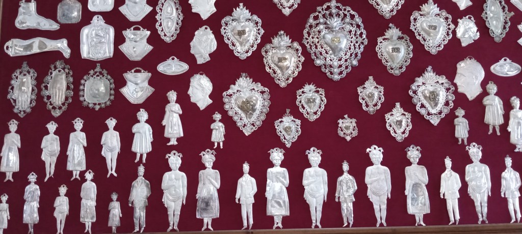 The sanctuary has lost some of its popularity since the opening of the shrine for Padre Pio at San Giovanni Rotondo, but it reportedly still draws about 1.5 million visitors per year. If you ever go there, I recommend seeing the Ex-voto room, where the walls are covered with silver renditions of hands, arms, legs, hearts, and lungs, testaments to the Virgin’s healing powers. [FYI, in ancient Roman times, people who successfully invoked the help of Aesculapius, the god of healing, would put up similar votives in the temples dedicated to him.] By the way, the views of the valley below are spectacular.